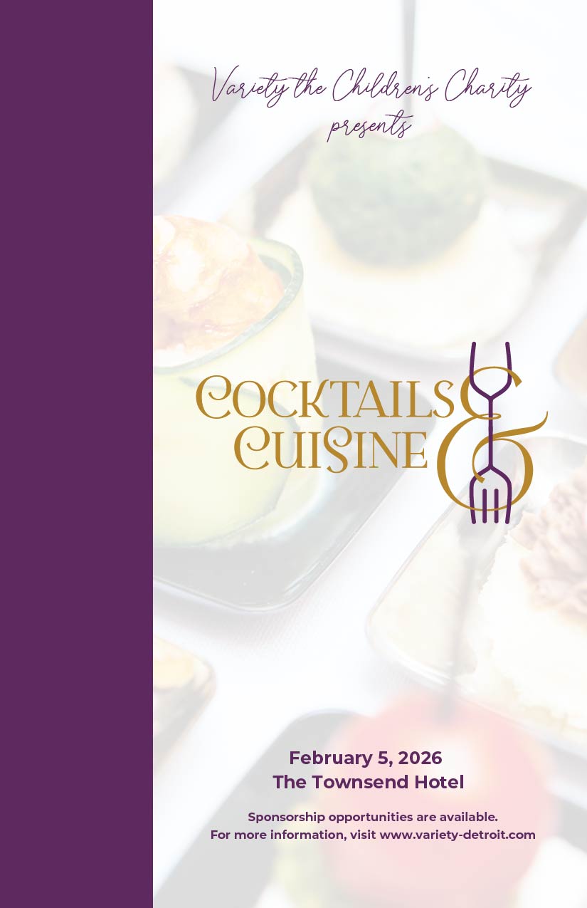 During Variety Cocktails & Cuisine, our supporters will socialize and stroll their way through the evening with some of Metro Detroit’s most talented chefs! With your support, guests will enjoy a taste of the town in the comfort of The Townsend Hotel with cocktails and creative Chef’s Choice selections. Food, beverages, raffle opportunities, valet and entertainment will be provided.